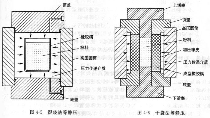 干袋法等靜壓成型,加壓橡皮模是事先放入缸體內(nèi)的,工作時不敢出。粉料裝入成型橡皮模后,一起放進(jìn)加壓橡皮模內(nèi),或?qū)⒎哿蠌纳厦嫱ㄟ^進(jìn)料斗,送至加壓橡皮模中,成型橡皮模是與液體介質(zhì)不相接觸的,因此稱為干袋法。這種方法可以實(shí)現(xiàn)連續(xù)操作,把上蓋打開,從料斗中裝料,然后蓋好上蓋,加壓成型。出坯時,把上蓋打開,通過底部的頂棒把坯件從上面頂出來。干袋法自動程度高,操作周期短,適用于大批量生產(chǎn),但因加壓橡皮模不易經(jīng)常更換,成型的產(chǎn)品尺寸和形狀受到限制。干袋法等靜壓的模具及坯料的放置方式如圖4-6所示。